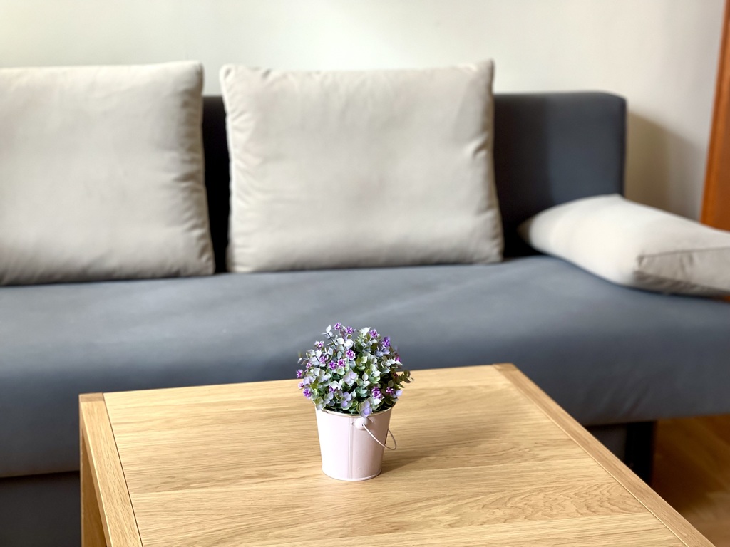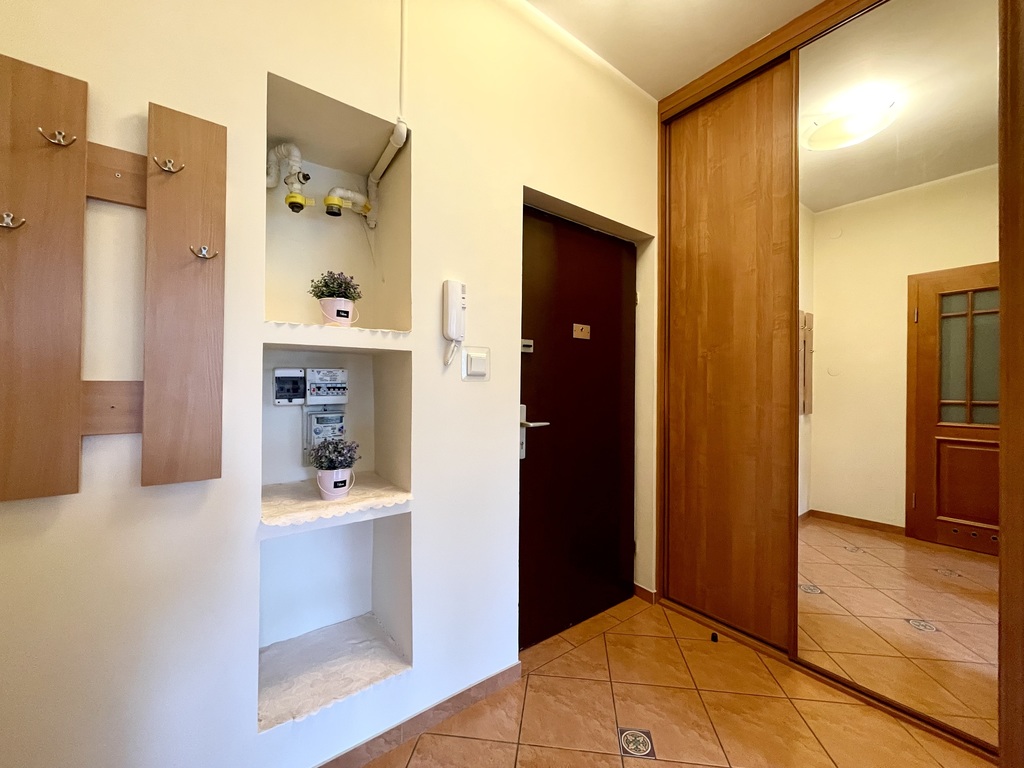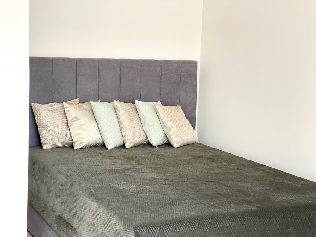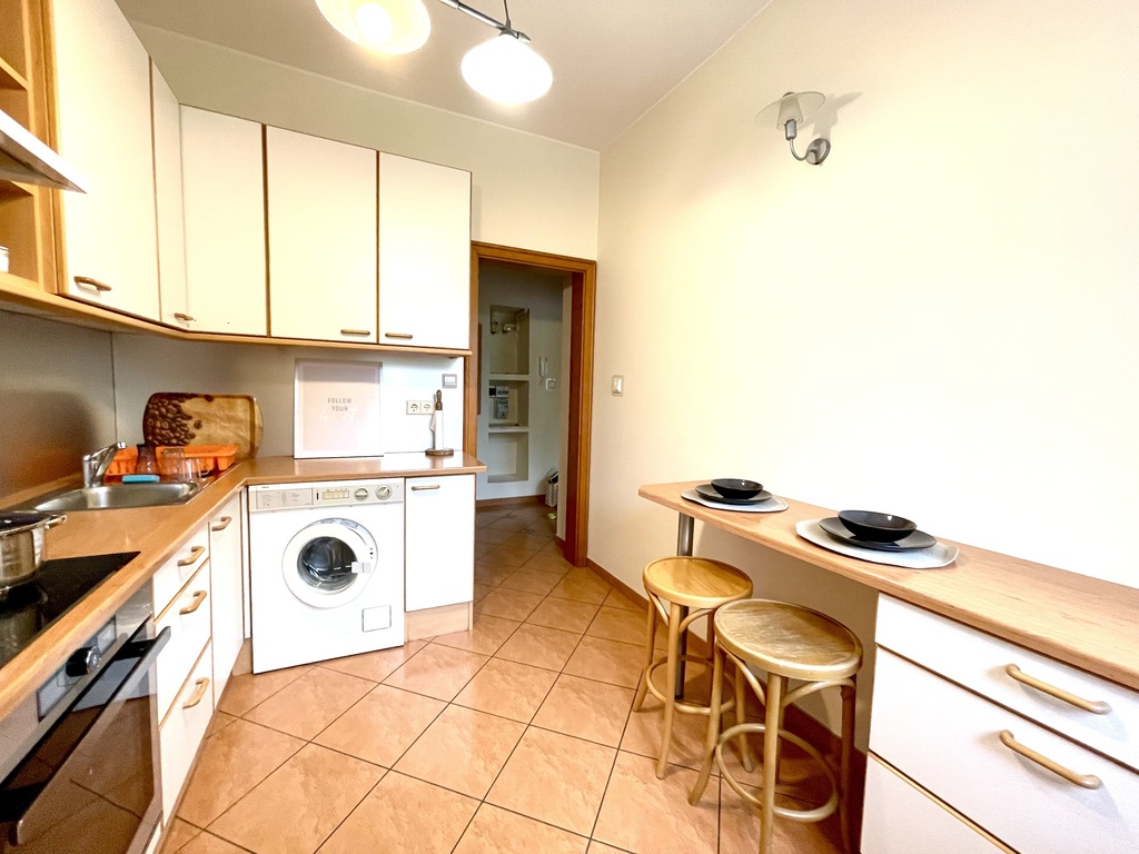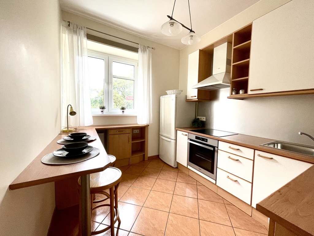 Mieszkanie w całości wyposażone, w pokoju rozkładana sofa, nowe duże łózko, w kuchni meble w zabudowie, lodówka, zlewozmywak, kuchenka, piekarnik, stolik z krzesłami barowymi oraz pralka. W przedpokoju duża 2-drzwiowa szafa w zabudowie.