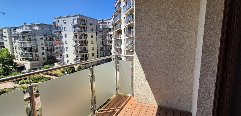 - Salon z wyjściem na duży balkon z widokiem na wewnętrzny dziedziniec — doskonałe miejsce do relaksu.