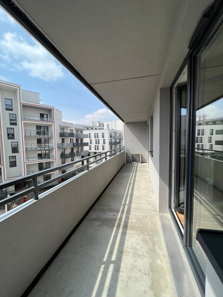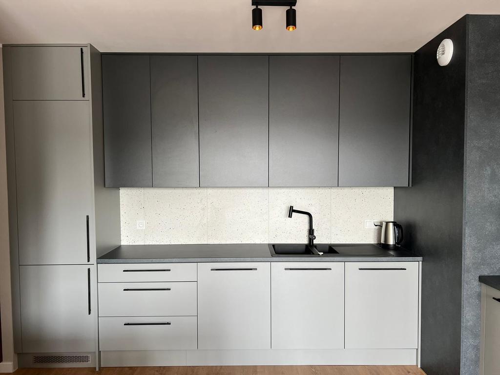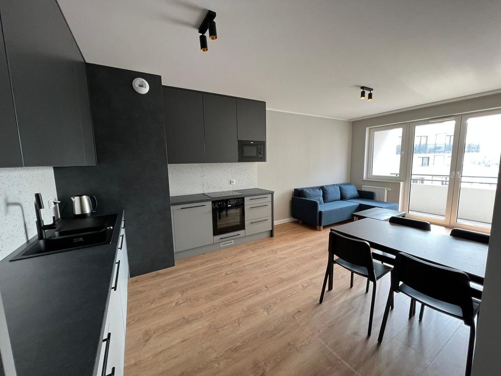 > komfortowy salon z aneksem kuchennym z wyjściem na duży, słoneczny balkon o powierzchni 11,60 mkw, kuchnia w zabudowie wyposażona w niezbędne sprzęty AGD (lodówko-zamrażarka, kuchenka, piekarnik, okap), część wypoczynkowa z rozkładaną sofą narożną
