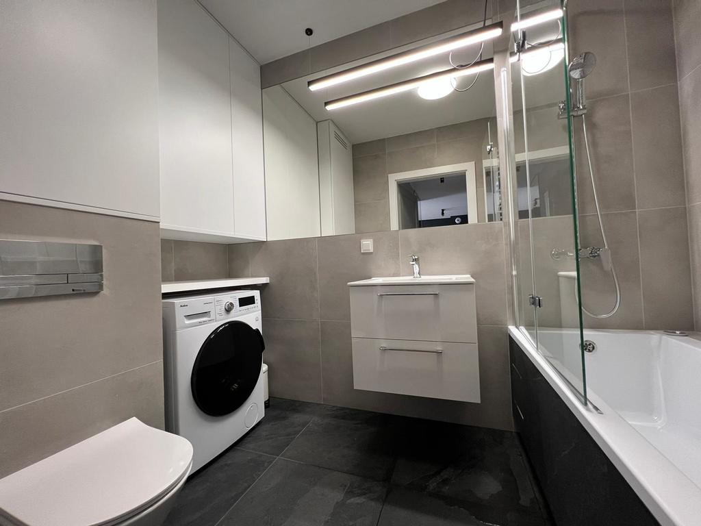 > łazienka wyposażona w wannę, pralkę, wykonana zabudowa meblowa na wymiar z miejsce do przechowywanie ręczników, środków czystości itp.