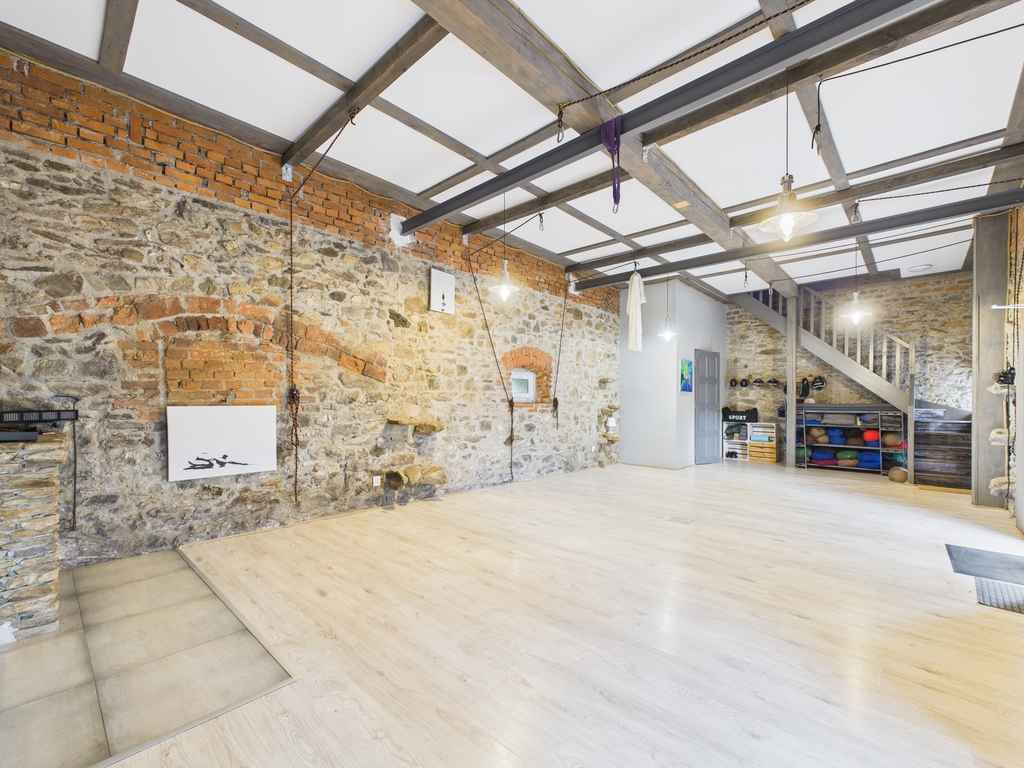 Na terenie posesji znajduje się w pełni wyposażony obiekt o powierzchni 100 m², w którym mieści się duża sala treningowo-warsztatowa. Obecnie wykorzystywana jest do organizacji warsztatów jogi, treningów bokserskich oraz zajęć ruchowych. Pomieszczenie jest przestronne, jasne i gotowe do użytku – idealne dla osób planujących prowadzenie działalności sportowej, rekreacyjnej lub szkoleniowej.