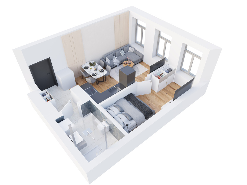 Składaj się z salonu z aneksem kuchennym, sypialni, łazienki i przedpokoju.