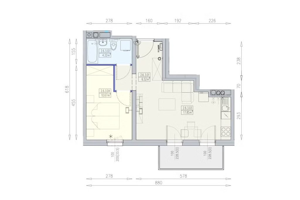 Mieszkanie ma pow. użytkową 39.26 m2 i składa się z: