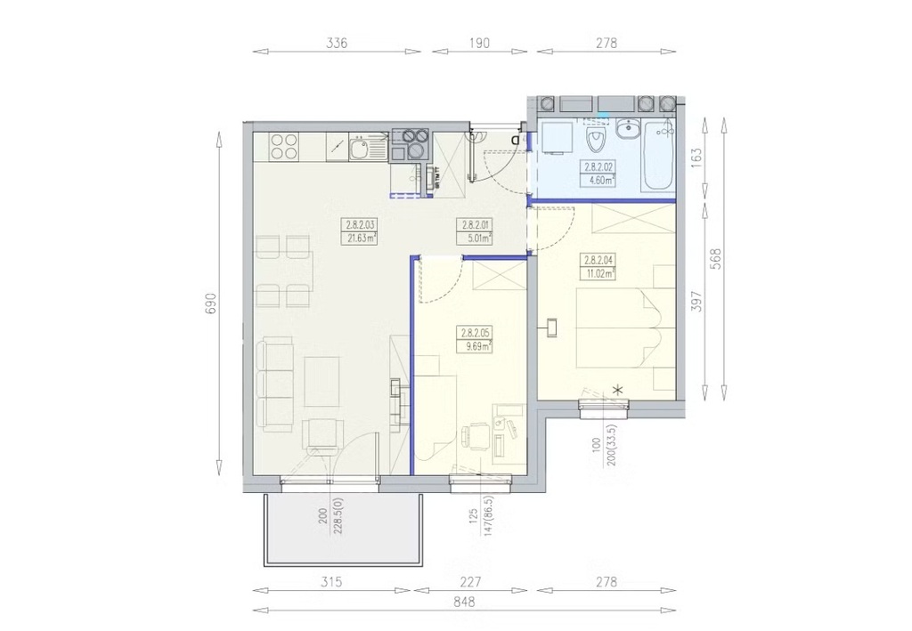 Mieszkanie ma pow. użytkową 51.95 m2 i składa się z: