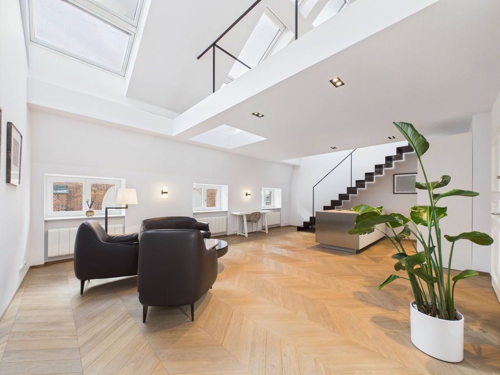 Mieszkanie zachwyca przestrzenią, światłem oraz dopracowanymi detalami. Wysokie sufity, antresola i skosy nadają wnętrzu charakteru oraz poczucia otwartości. Okna połaciowe zapewniają doskonałe doświetlenie i podkreślają nowoczesny, a jednocześnie bardzo elegancki styl nieruchomości.