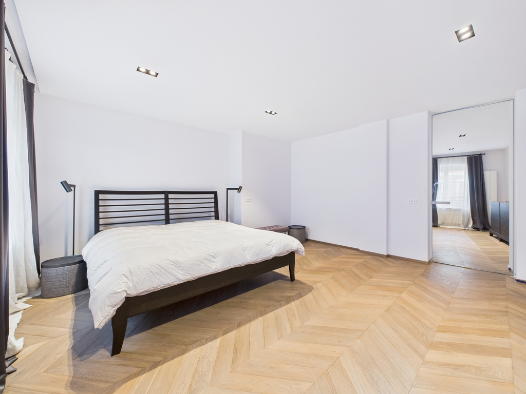 Przestronna sypialnia została uzupełniona o otwartą, dużą garderobę, tworząc wygodną i luksusową część prywatną.