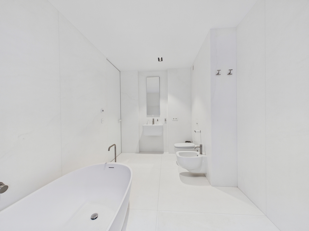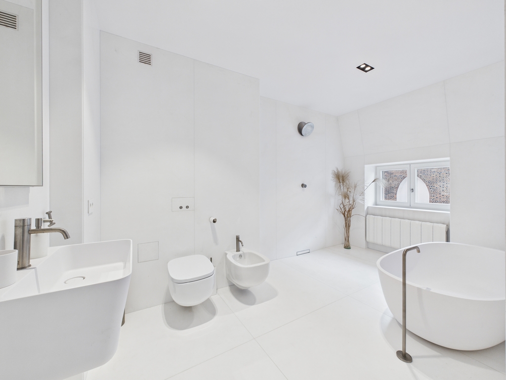 Do dyspozycji są dwie łazienki – elegancka łazienka gościnna, połączona z pomieszczeniem gospodarczym z pralką, oraz druga, większa, wyposażona zarówno w prysznic, jak i wannę.