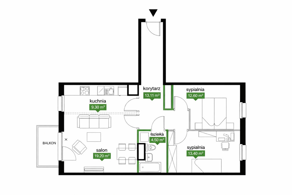 Mieszkanie ma pow. użytkową 71.35 m2 i składa się z: