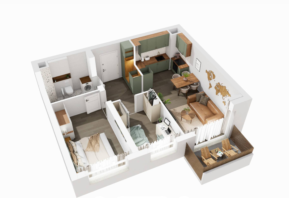 Mieszkanie ma bardzo przemyślany układ – część dzienna jest jasna i ustawna, a dwie sypialnie dają wiele możliwości aranżacyjnych (sypialnia + gabinet, pokój dziecka lub gościnny).