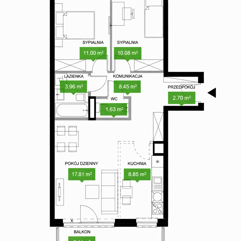 Mieszkanie ma pow. użytkową 64,48m2 i składa się z: