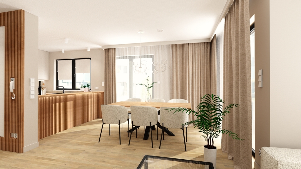 - Dużego salonu z aneksem, z możliwością wydzielenia kuchni
