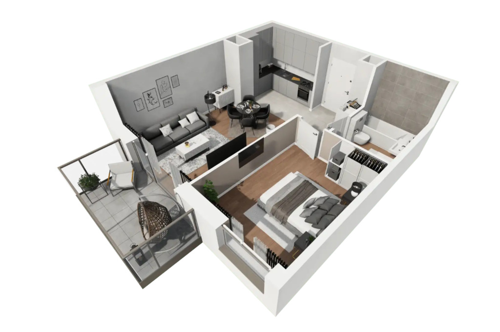 Mieszkanie wyróżnia się świetnym układem i dużym, ustawnym pokojem dziennym z możliwością komfortowej aranżacji części wypoczynkowej oraz jadalnianej. Przestronny balkon zapewnia dodatkową prywatną strefę wypoczynku.