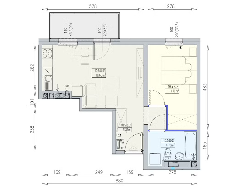 - salon z aneksem kuchennym z wyjściem na balkon,