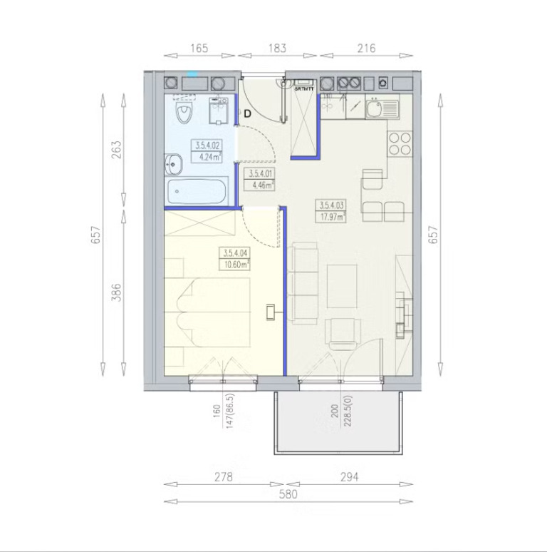 Mieszkanie ma 37,5 mkw i obejmuje następujące pomieszczenia: