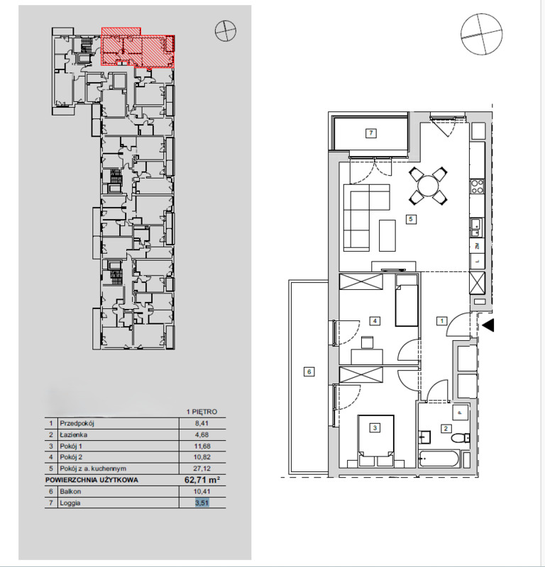Łączna powierzchnia mieszkania: 62,57 m²