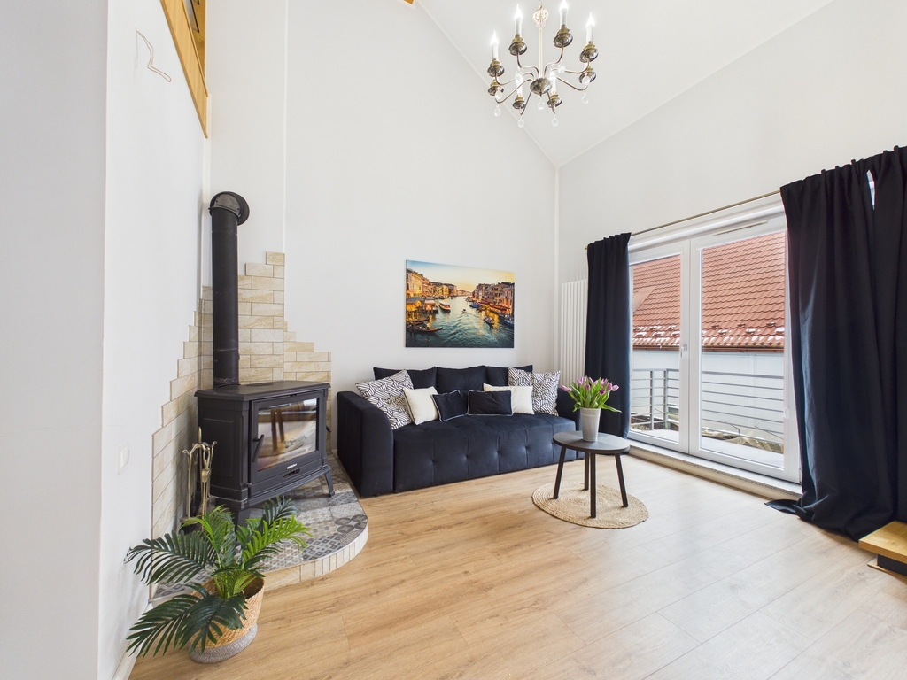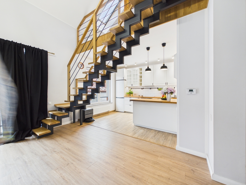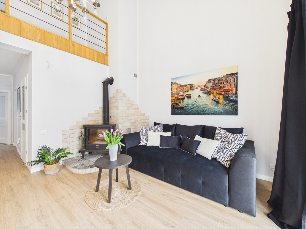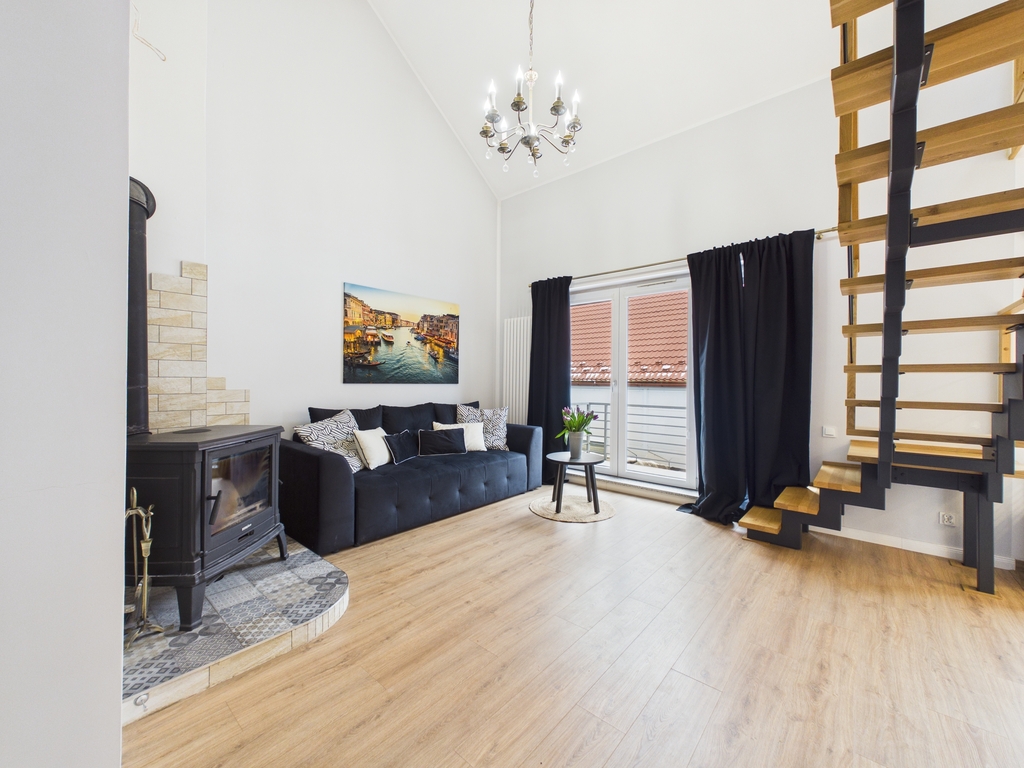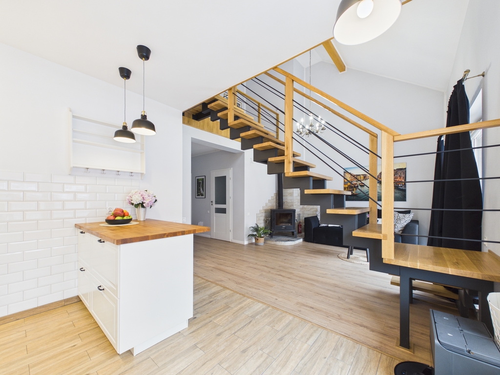 To, co wyróżnia tę nieruchomość, to nietspotykana wysokość salonu – aż 5,75 metra. To rozwiązanie w połączeniu z otwartą antresolą tworzy efekt "wow", który poczujesz od razu po wejściu. To przestrzeń, która oddycha, daje poczucie wolności i luksusu, jakiego nie znajdziesz w klasycznym budownictwie.