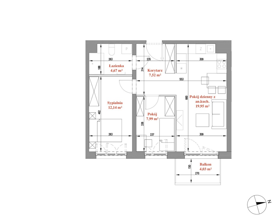 Mieszkanie ma pow. użytkową 52,3 m2 i składa się z: