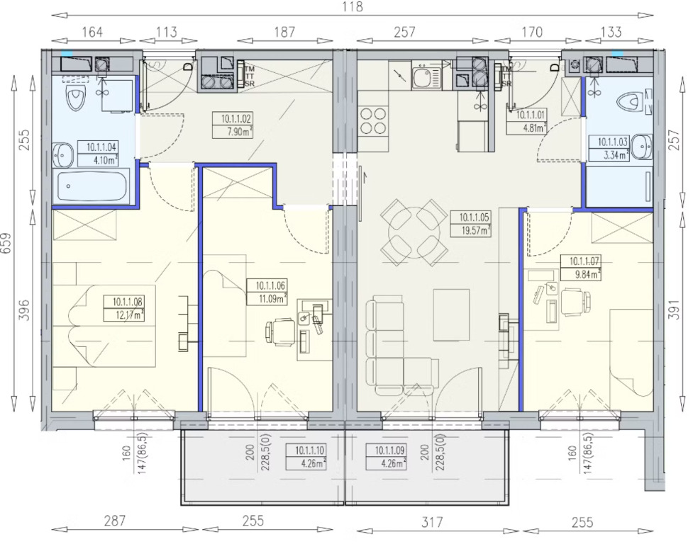 Nieruchomość o łącznej powierzchni 73,83 m² została zaprojektowana jako dwa niezależne lokale mieszkalne, każdy z osobnym wejściem, co czyni ją doskonałą inwestycją pod wynajem.