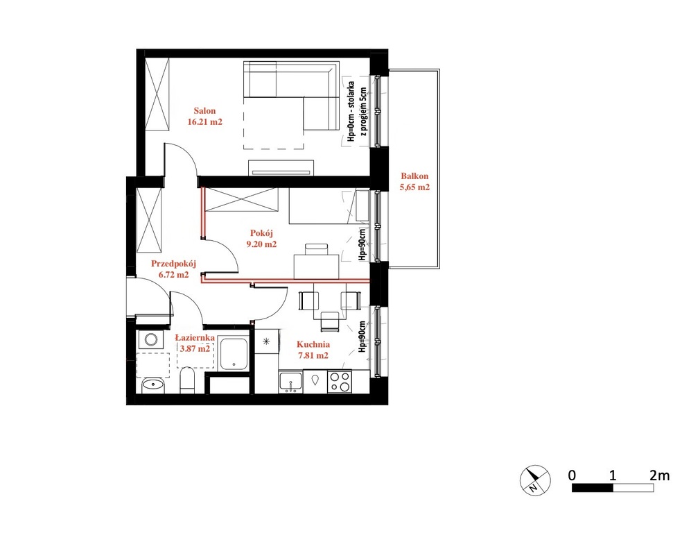 Mieszkanie ma pow. użytkową 43.81 m2 i składa się z: