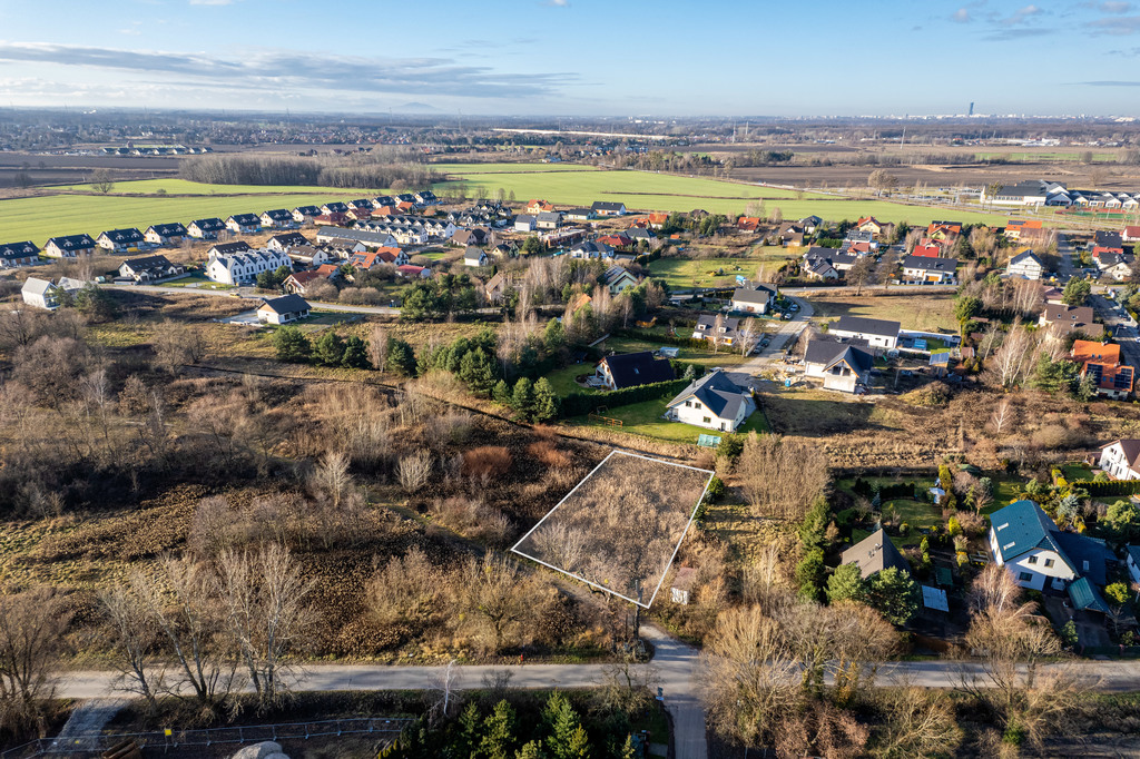 Działka o powierzchni 1000 mkw., kształt zbliżony do prostokąta. Wymiary około 45 m x 22 m.