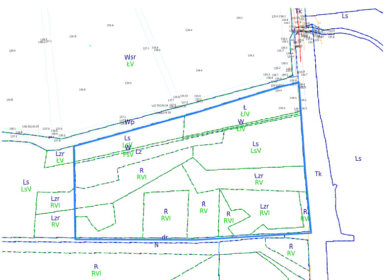 Teren ma nieregularny kształt, granice zmieniają kierunek kilkukrotnie, co nadaje działce charakterystyczny układ. Składa się z różnych klas gruntów rolnych: RVI, RIVa, RIIIb, RV, ŁV oraz PsVI. Dzięki temu działka oferuje zróżnicowany potencjał użytkowy – od upraw polowych po pastwiska lub możliwość realizacji drobnych inwestycji rolnych zgodnie z MPZP.