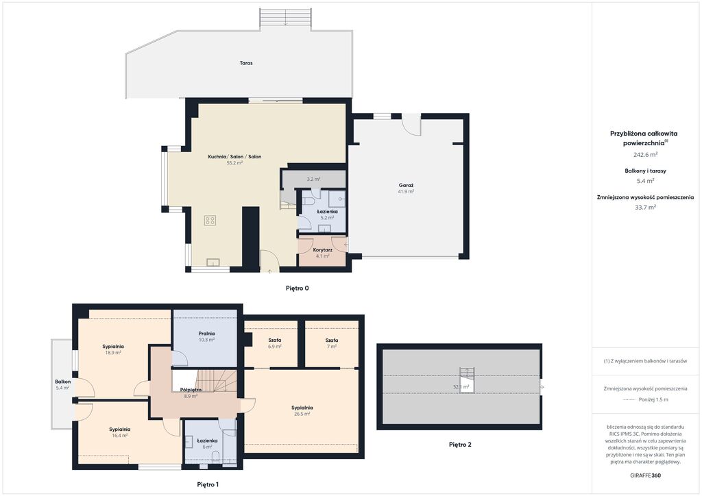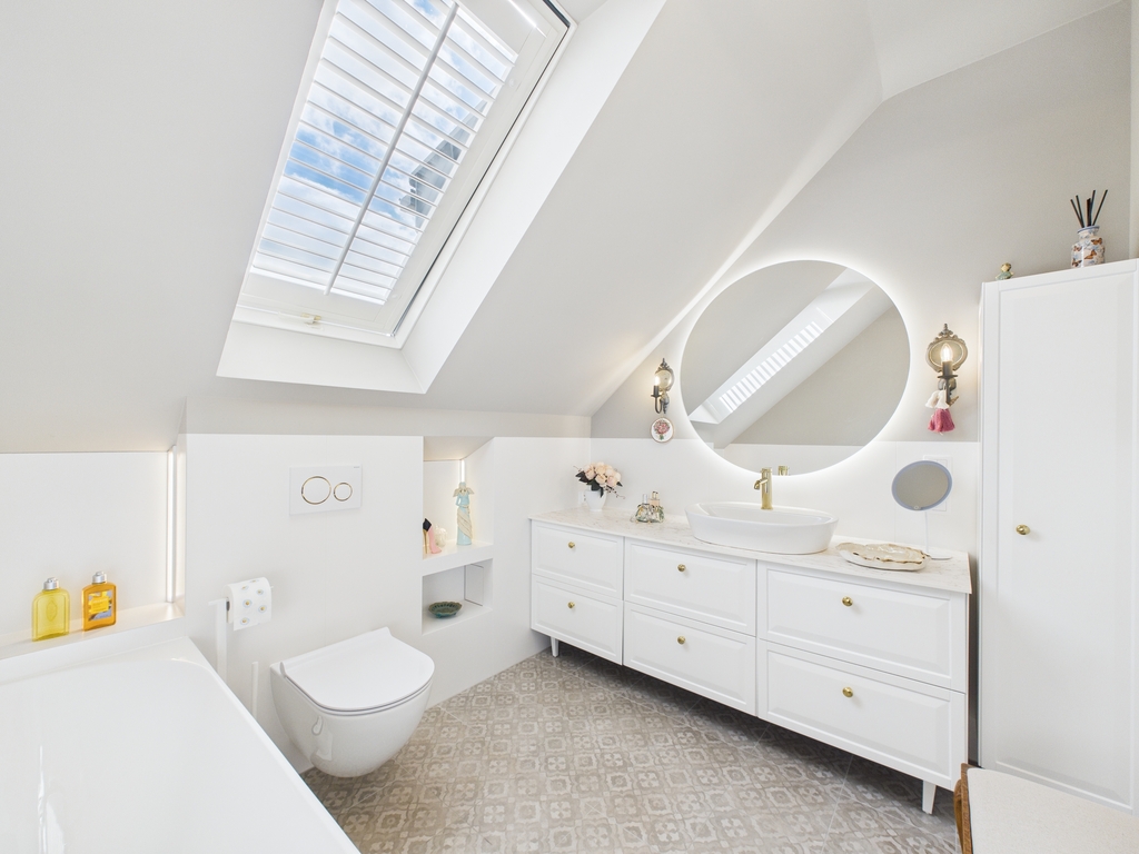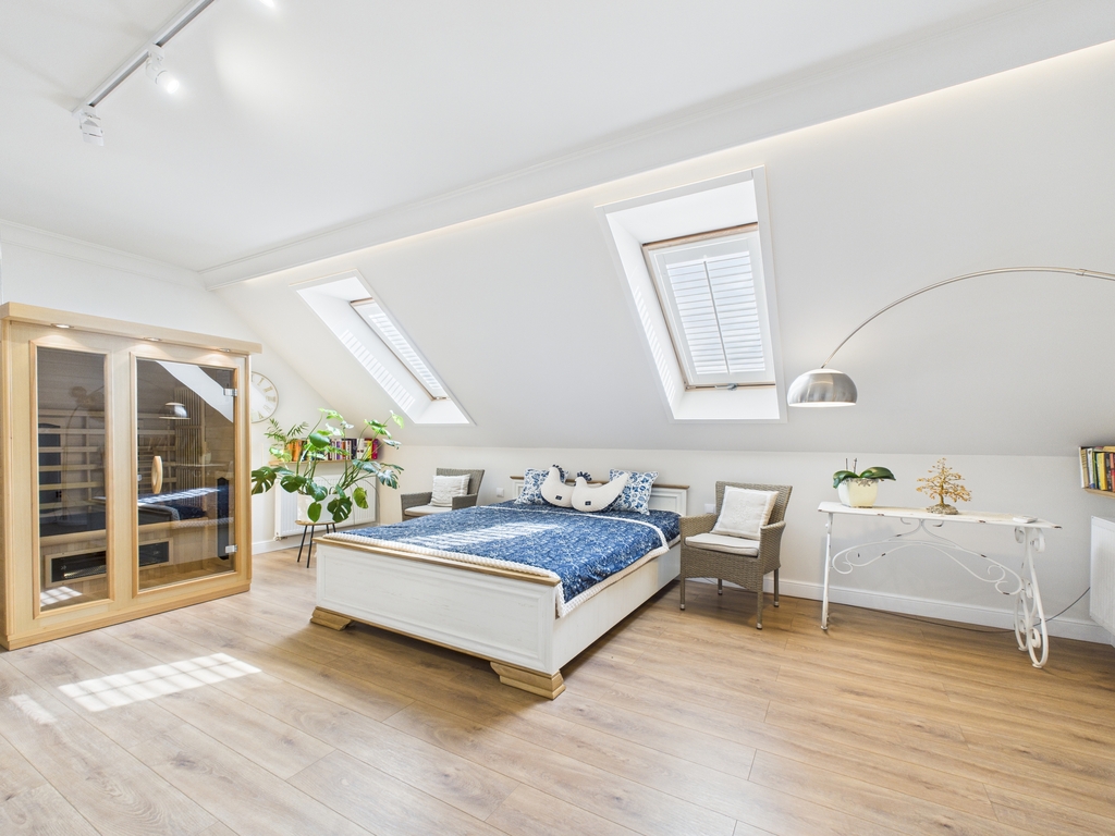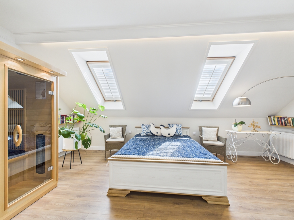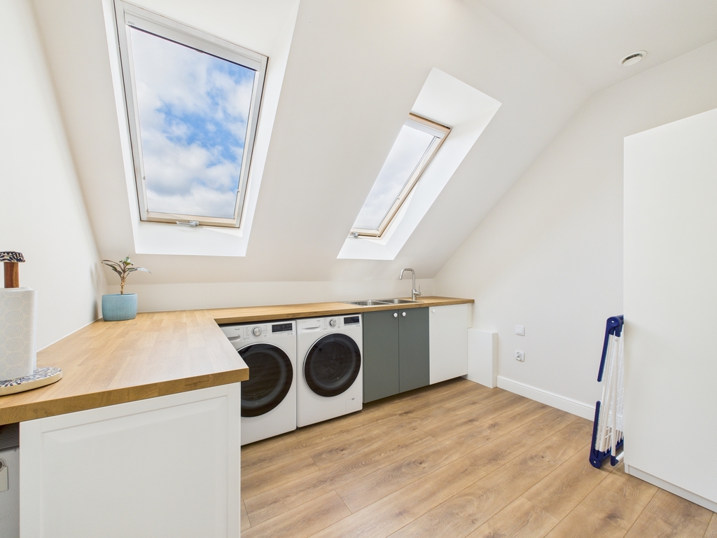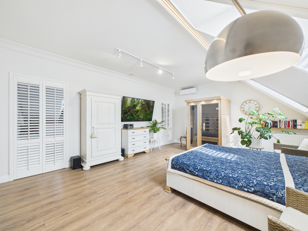 Piętro zostało zaplanowane z myślą o prywatności i wygodzie. Główna sypialnia kryje dwie oddzielne garderoby oraz prywatną saunę, tworząc strefę relaksu godną najlepszego spa. Dwie dodatkowe sypialnie i pokój zaadaptowany jako pralnia i przestrzeń gospodarcza zapewniają domownikom codzienny komfort. Całość dopełnia łazienka, w której wanna staje się miejscem wyciszenia i odprężenia.