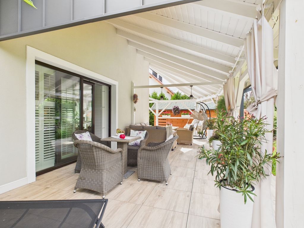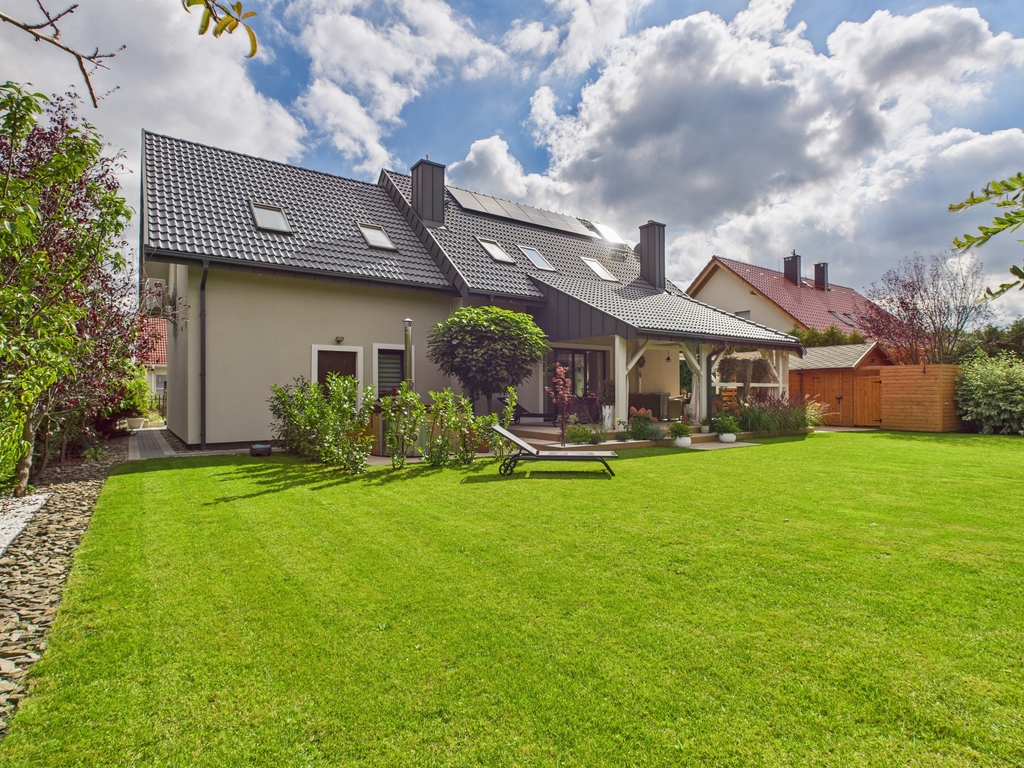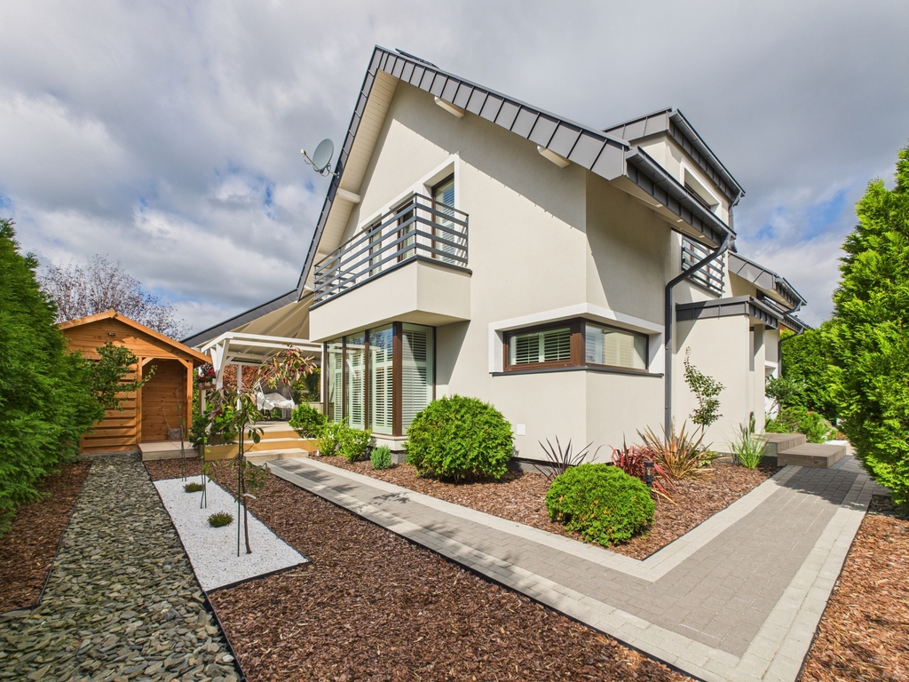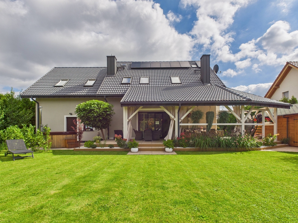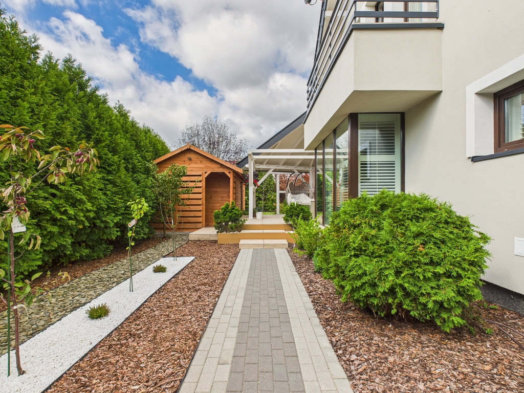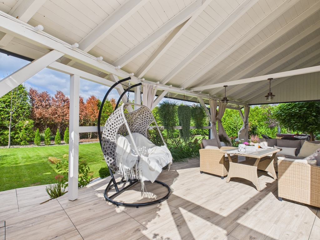 Na zewnątrz czeka ogród, który zachwyca dbałością o detale tak samo jak wnętrze. Taras stanowi doskonałą przestrzeń do odpoczynku, a balia opalana drewnem zamienia letnie, ale również zimowe wieczory w wyjątkowe przeżycie. Całość uzupełnia starannie dobrana roślinność tworząca atmosferę spokoju a także domek na sprzęt ogrodowy z drewutnią.