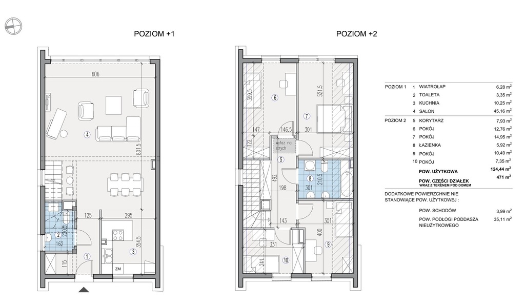 Prezentowany dom o pow. 124.44 mkw składa się z: