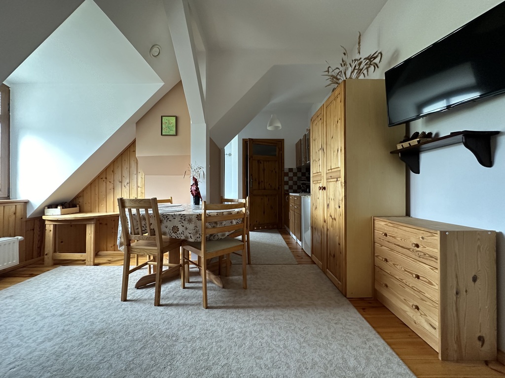 w części do wynajmowania znajduje się trzy pokoje dwuosobowe z łazienkami i aneksami kuchennymi, trzy apartamenty trzyosobowe z łazienkami i aneksami kuchennymi oraz z dwa apartamenty czteroosobowe również z łazienkami i aneksami kuchennymi. Goście mogą korzystać z dużej sali z kominkiem i dużą kuchnią gdzie można biesiadować.