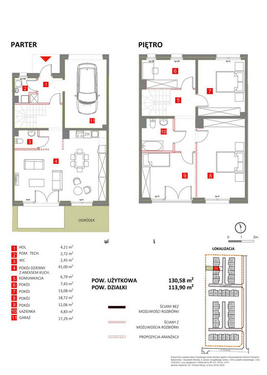 Dom o powierzchni użytkowej 130,58 m², z prywatnym ogrodem oraz garażem w bryle budynku (17,29 m²). Funkcjonalny układ pomieszczeń idealny dla rodziny.